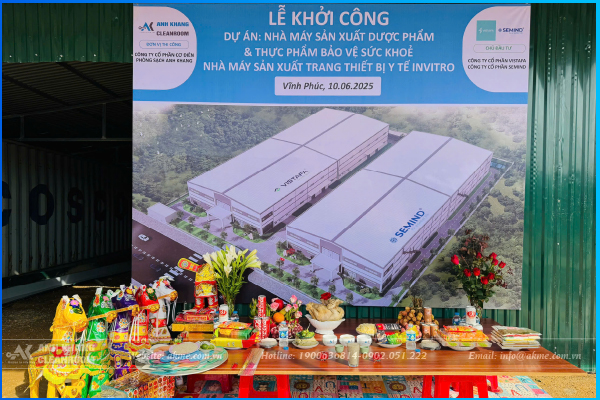 Lễ Khởi Công Nhà Máy Sản Xuất Dược Phẩm Và Trang Thiết Bị Y Tế Tại Vĩnh Phúc vừa diễn ra ngày 10/06/2025 là một cột mốc quan trọng với ngành y tế Việt Nam. Dự án do Công ty Cổ phần Semind và Công ty Cổ phần Vistafa đầu tư, thi công bởi Anh Khang Cleanroom – nhà thầu thi công phòng sạch uy tín. Với mục tiêu cung cấp sản phẩm đạt chuẩn GMP, tổ hợp nhà máy này được thiết kế theo tiêu chuẩn quốc tế với hệ thống HVAC phòng sạch hiện đại.