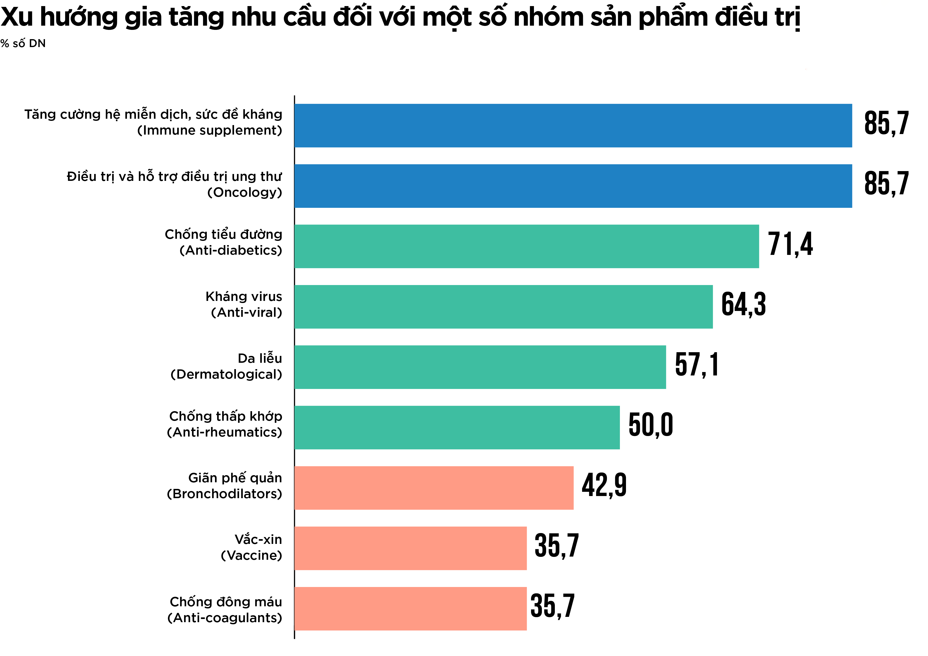 Về lĩnh vực điều trị, khảo sát của Vietnam Report chỉ ra rằng, nhu cầu đối với hai nhóm sản phẩm tăng cường hệ miễn dịch, sức đề kháng và điều trị, hỗ trợ điều trị ung thư có xu hướng gia tăng lớn nhất trong tối thiểu một năm tới, đạt 85,7%. Trong khi đó, nhóm sản phẩm vắc-xin và chống đông máu có xu hướng gia tăng thấp hơn, đạt 35,7%. Điều này hoàn toàn phù hợp với xu hướng chung của thế giới.