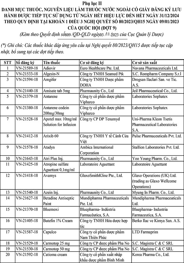 Quyết định số 809/QĐ-QLD ngày 03/11/2023 của Cục Quản lý Dược về việc công bố Danh mục thuốc, nguyên liệu làm thuốc có giấy đăng ký lưu hành được tiếp tục sử dụng theo quy định tại khoản 1 Điều 3 Nghị quyết số 80/2023/QH15 ngày 09/01/2023 của Quốc hội (Đợt 9)